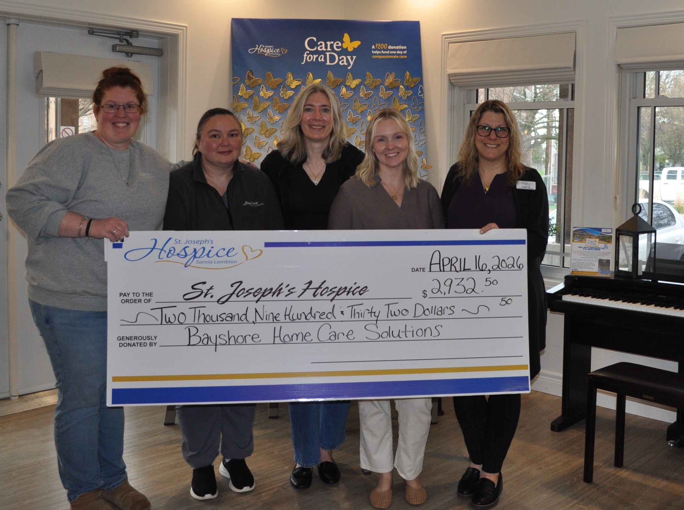 On March 13, 2026, Bayshore Home Care Solutions hosted a Chuck-A-Puck event at the Sarnia Sting Game, in support of St. Joseph’s Hospice. The event was a great success, raising much needed funds for St. Joseph’s Hospice and allowing several individuals to give back to their community by volunteering their time. On April 16, 2026, members of Bayshore Home Care Solutions presented St. Joseph’s Hospice with a $2,932.50 cheque. We are so thankful to Bayshore Home Care Solutions and the Bayshore Foundation for their continued support of St. Joseph’s Hospice and those we serve!